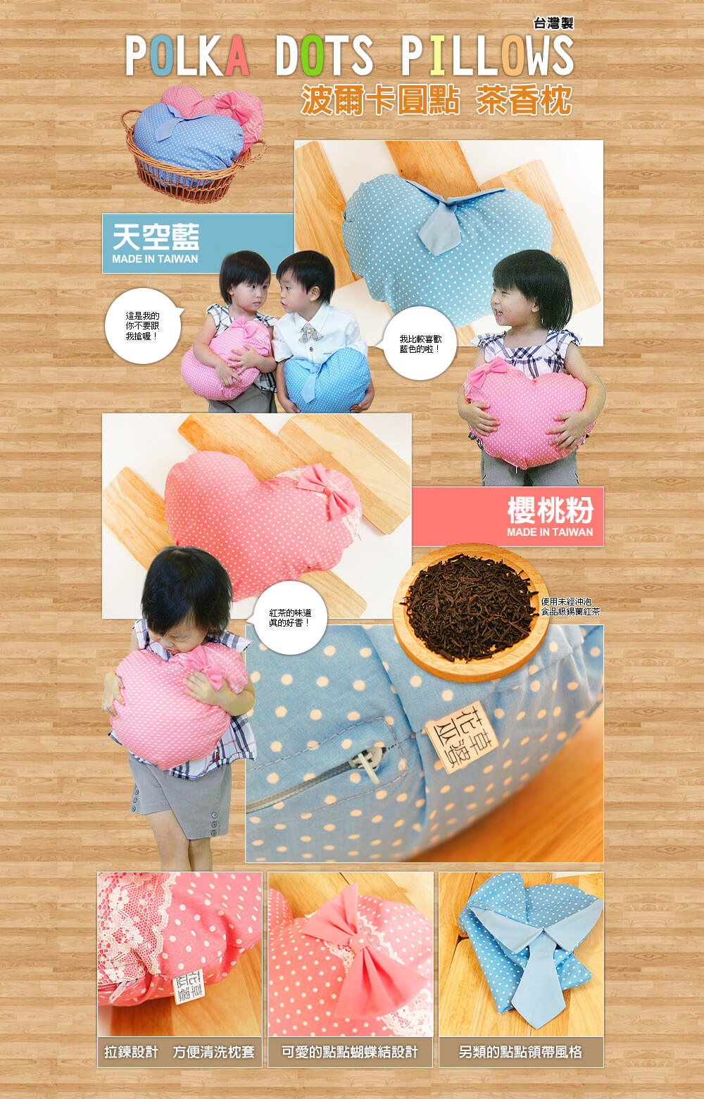 感謝「上班這黨事」推薦!歷久彌新波爾卡圓點,今年送個不一樣的禮物給親愛的人吧!今年送個不一樣的禮物給親愛的人吧!正面是輕柔的綿質觸感,背面是芳香宜人的茶香,無論抱著那一面,都能讓你擁有與情人相伴的好心情 。花草巫婆茶香枕,用的填充材質是未經沖泡的阿薩姆紅茶葉;抱枕會自然地散發出淡淡的茶香味,擁抱在懷中聞到清香的味道,能放鬆身體、感覺清爽舒暢。 比起一般抱枕,茶香枕最大的好處 就是有天然的茶香催人入眠,同時也可以鎮定心情。 相較於一般市售的高價茶葉枕,花草巫婆的茶香枕採用雙面填充設計,一面是清香的阿薩姆紅茶葉,一面是是蓬鬆輕柔的綿花;不僅減低了成本,回饋給你更超值的價格,同時也保有了一般茶葉枕所沒有舒適和彈性。